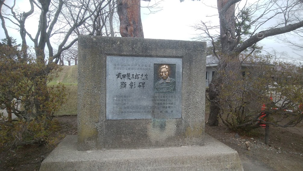 五稜郭の中を散策していた時に建物や施設が集まっている一画に見つけて立寄りました。顕彰碑ですがレリーフが埋め込まれたスタイルのもので、武田斐三郎氏の顔のレリーフ部分は撫でられてるのか、金属が磨きあがって金ぴかになっていてかなり目立っていました。五稜郭を設計・監督した人物で、いわゆる五稜郭の生みの親ということです。幕末当時の社会情勢や国際情勢を考慮してつくられた城であって、当時の最先端技術をもった、技術者ということです。顕彰碑としては目立った特徴があるものではないです。時間があれば立寄る感じです。