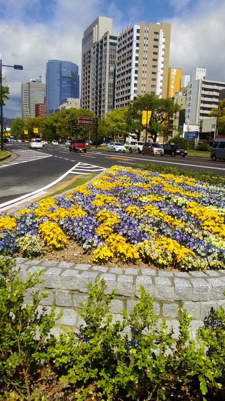 広島では100メートル道路とも言われています。4月中旬、平和大通りを歩いてみると、いたるところの花壇にきれいな花が植えられていました。5月のゴールデンウィークに行われるフラワーフェスティバルに向けて平和大通りも華やかになってきました。