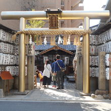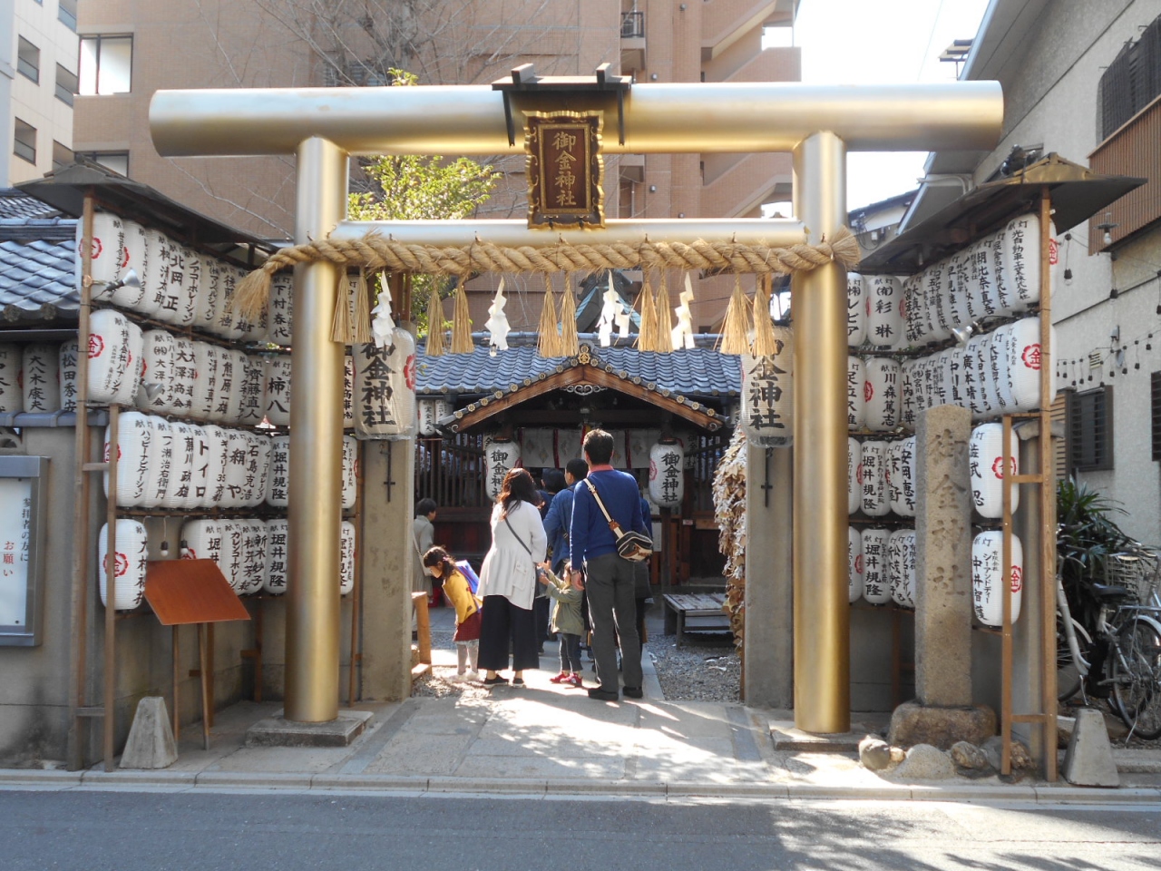 二条城の近くの閑静な住宅街にあります。黄金色の鳥居がとても目立っていて、想像以上に豪華でした。神社はそれほど大きくないのですが、参拝客がたくさんで、ガードマンもいました。お金や資産運用の神様です。金色のお守りなども売られていました。絵馬もたくさん奉納されていました。