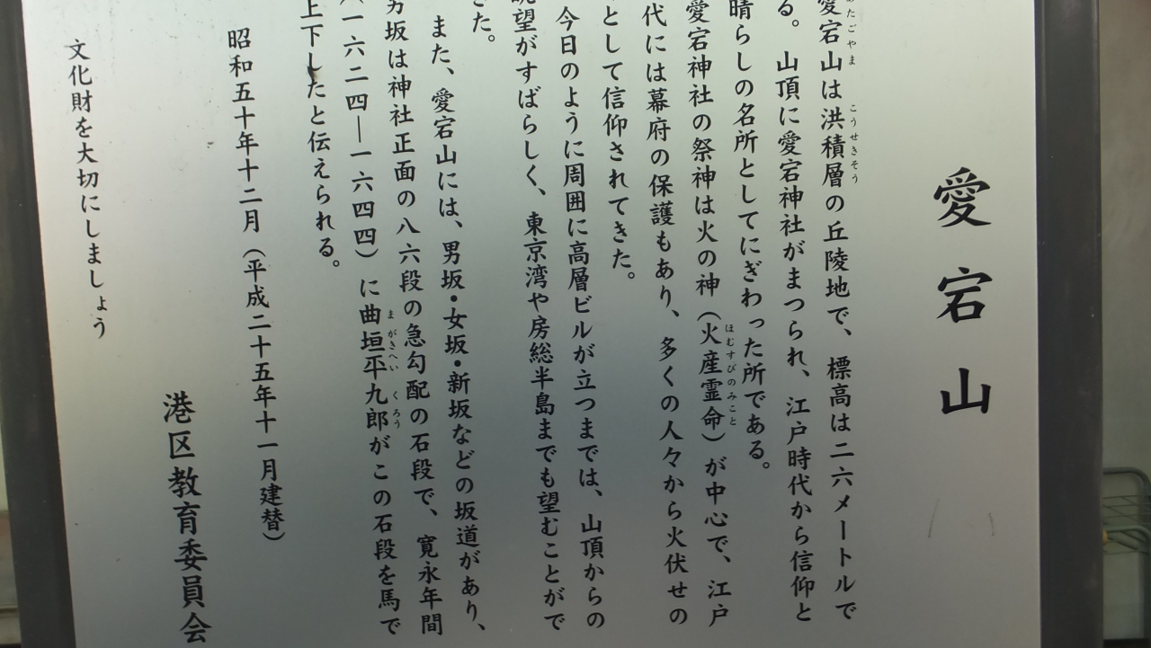 愛宕山は標高26mで、今では周囲に高層ビルも建ってしまいましたが、創建当時は周囲を見渡すことが出来ました。1603年(慶長8年)、徳川家康の命によって創建されたと伝わります。