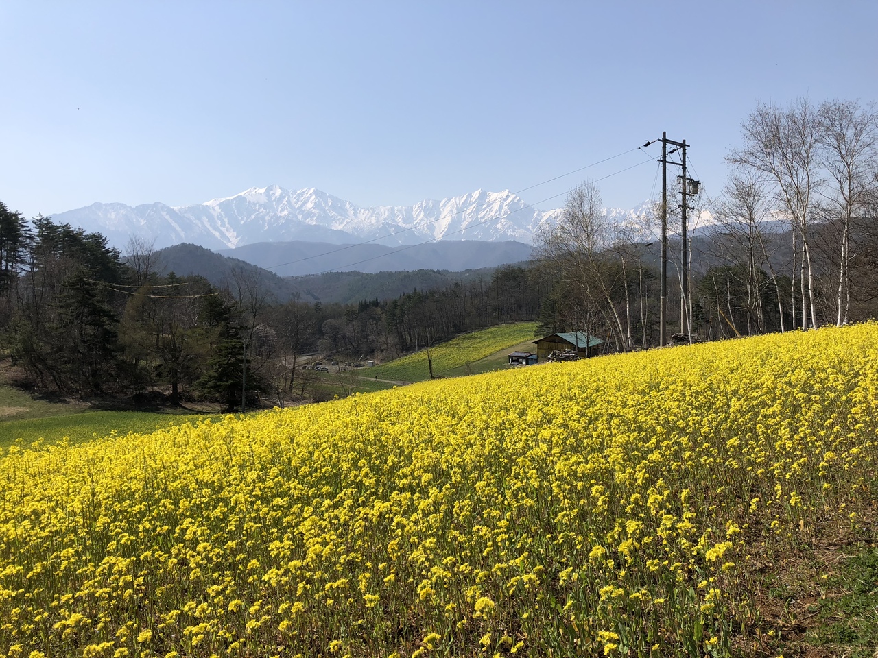 カーナビでは、キャンプ場しかでないので、近くのお店で教えてもらって行きました。整備の途中という感じで、入るところで応援の募金箱ありました。小高い丘からの眺めると、雪の北アルプスと菜の花畑のコラボが素晴らしくきれいでした。