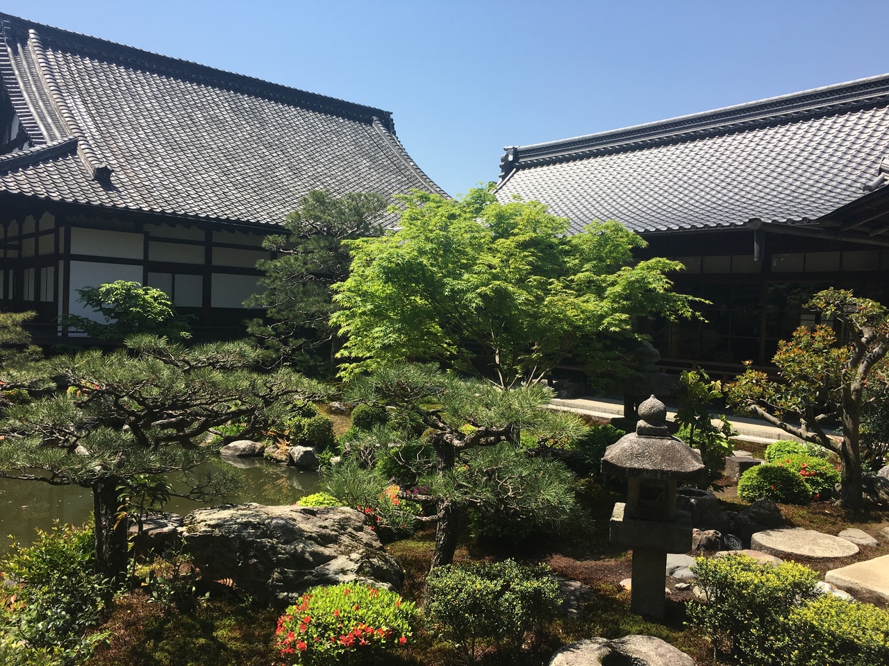 京阪電鉄の祇園四条駅から花見小路を経由して徒歩で15分ほど。土日は特に観光客が多く、場外馬券販売所もあるので、人は多めです。両足院に訪問しましたが、新緑の季節で気持ちの良い景色を楽しむことが出来ました。両足院は時々アートの展覧会をやっており、今回は中川幸夫さんの写真展を鑑賞しました。美術館とは一味違う雰囲気で楽しめました。