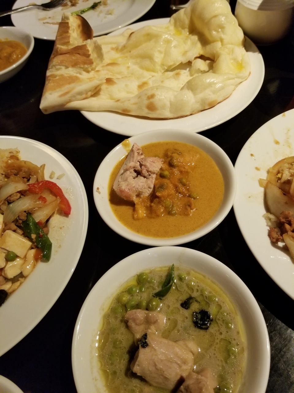 アジアンテイストの店内、ランチタイムのビュッフェに行きました。大きな焼きたてのナンがお代わり自由!日替わりの数種類の本格的なタイカレー、サラダ、前菜、副菜数種類、タンドリーチキン、タピオカデザート、チャイ、ソフトドリンク数種類と盛りだくさんな内容です。ナンがとても美味しいです。