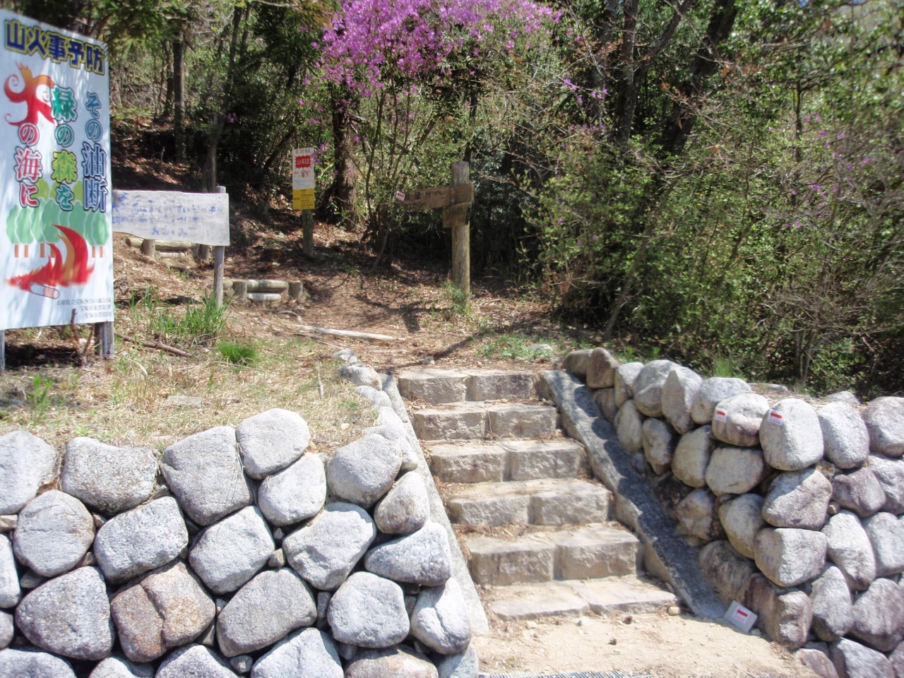 JR道場駅より一登りして丸山湿原を通って1時間50分西谷の森公園入口に到着。東の谷管理棟があり、その右手にハイキングコース入口があります。いきなり木段急登りが始まり、急登り、緩やかな登り、アップダウンを繰り返しつつ高度をかせぐ。桃色のミツバツツジが疲れを癒してくれる。30分弱で展望台(350M)に到着。360度のパノラマ、南遠くに六甲山が見える。羽束山、有馬富士、大岩ケ岳、布見竜王山等も見える。南に15分ほど下ると農業経験ができる農舎がある。本日のコース、多少のアップダウンはあるものの標高差も少なく 、大変歩き易いコースでした。また西谷の森公園ハイキングだけでも2時間弱のコースで小さな子供連れ家族でも楽しめるコースです