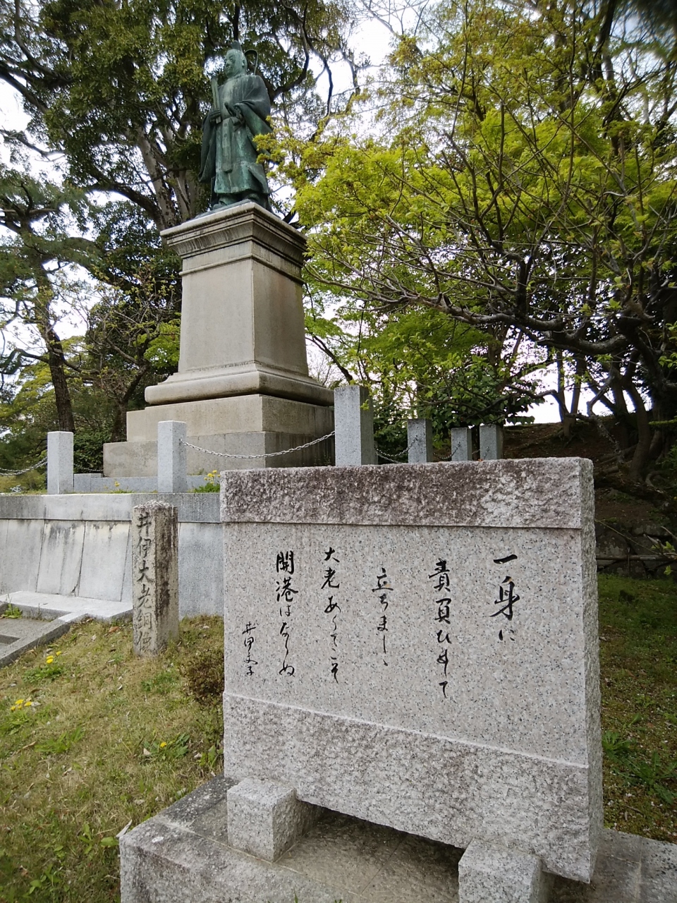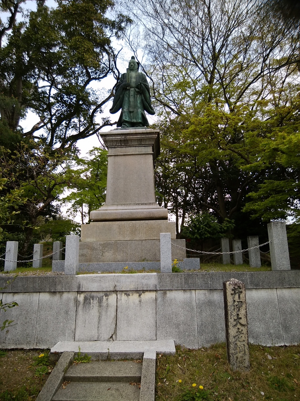 立派な台座の上に設置された立像です。正装なさったお姿です。春のにぎわった公園内でしたが駐車場との際で、静かな場所でした。気に留める方もまばらで、じっくりと拝見することができます。重責を覚悟をしのばれるお姿です。