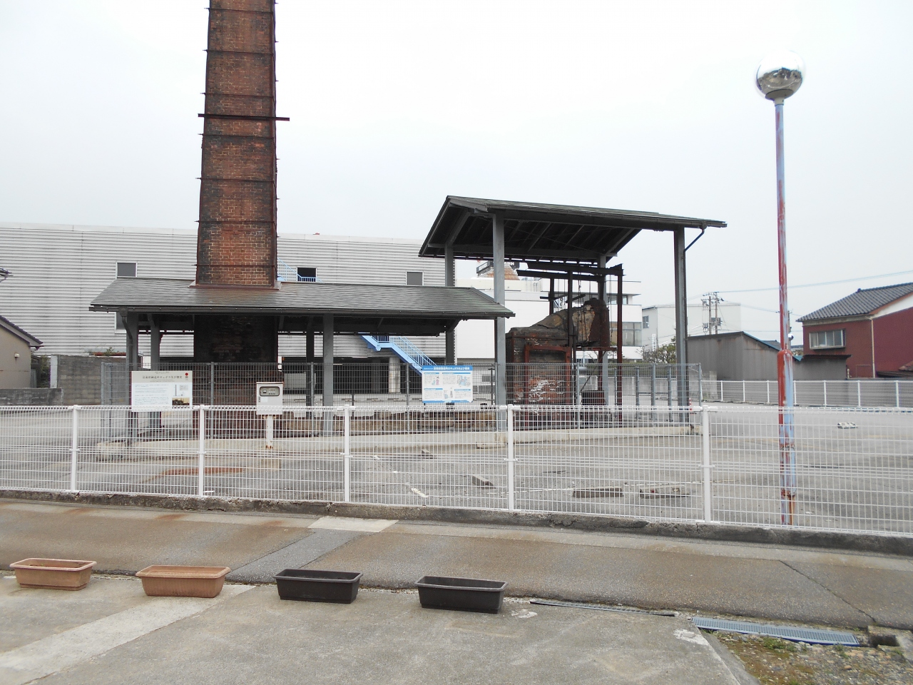 明治時代に造られた小型の溶鉱炉が保存されていました。金網で囲まれた駐車場の中央にさらに金網でグルッと取り囲まれてます。最初、(私有地かもしれない)駐車場に入っていのかと躊躇しました。パネル表示もあったので、入っていいみたいです。このロケーションはなんだか侘しかった。
