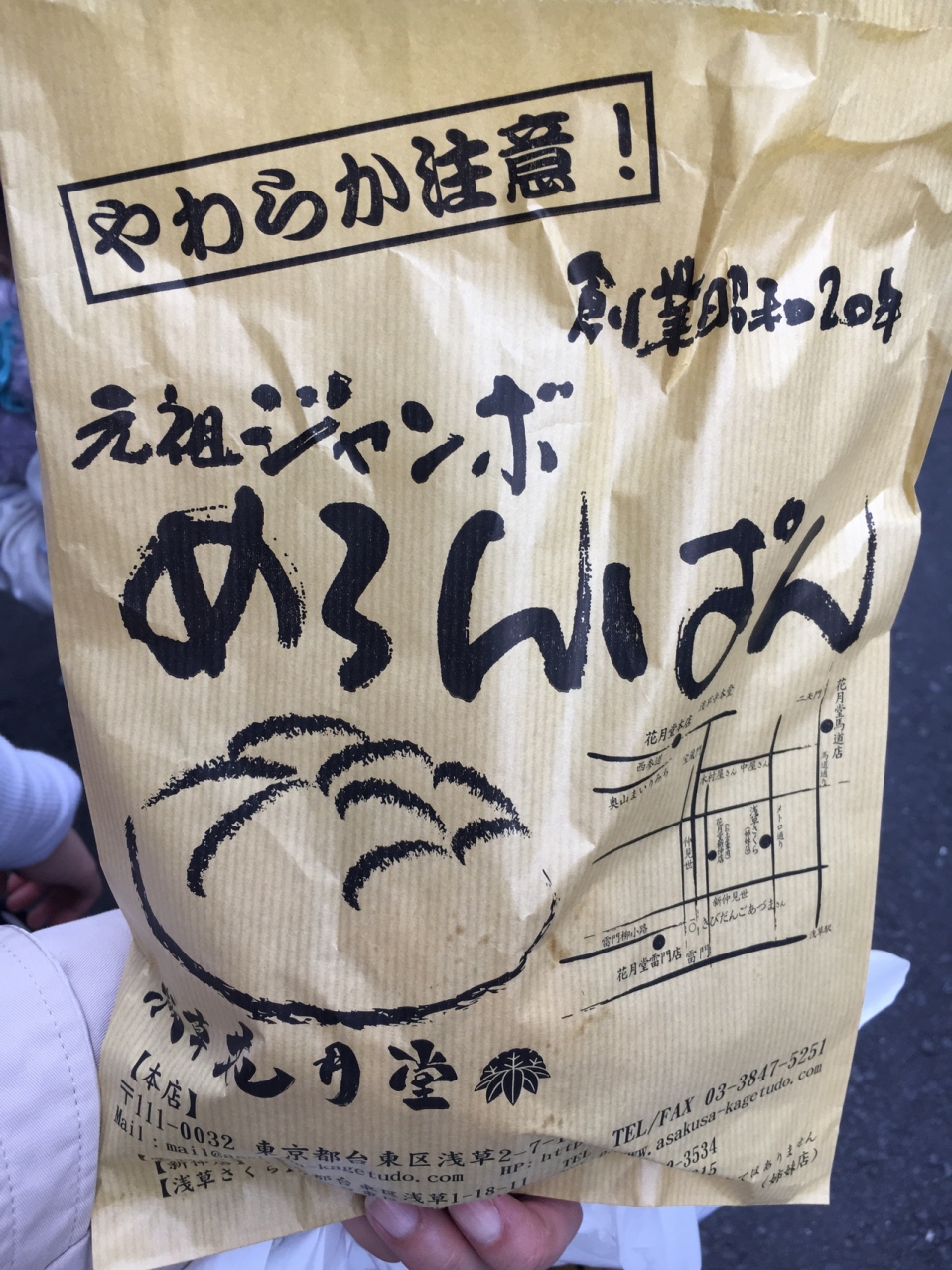 テレビで紹介されていたジャンボメロンパン。夕方4時ぐらいに行ったので、もう既に売り切れ。もう1店舗あると言うことで、雷門に近いこの店きました。行列に並んでいるときに、あと10個という声が聞こえてきて心配でしたがギリギリ購入できました!