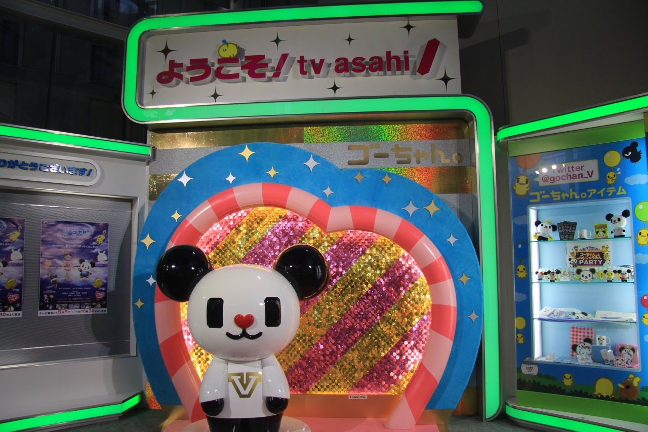 総ガラス張りのテレビ朝日の建物の前で、丁度天気予報のリハーサルが行われていました。テレビ朝日のマスコットキャラクター・ゴーちゃんもいて子供たちに人気でした。