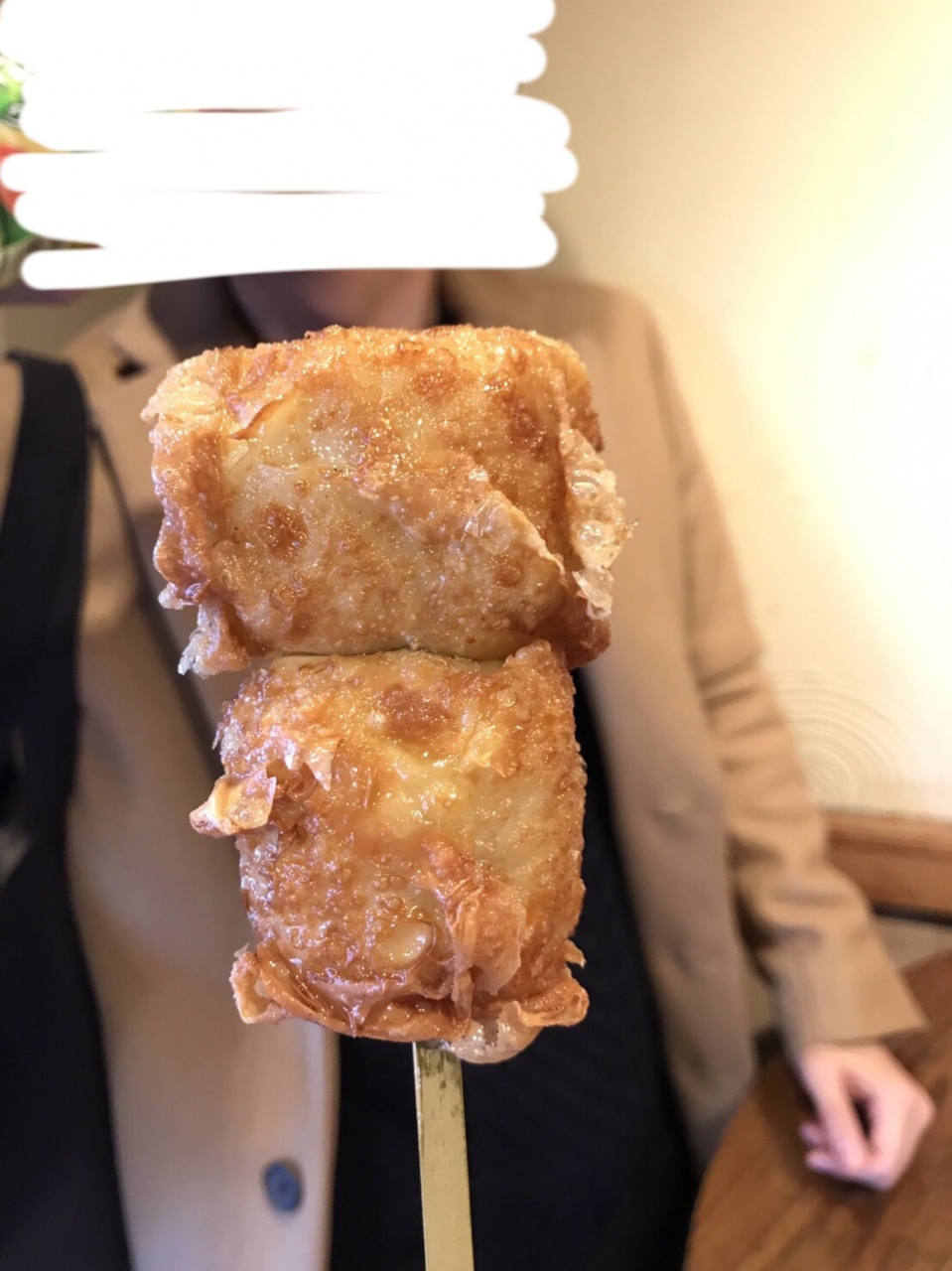 嵐山の食べ歩きやお土産屋さんが立ち並ぶストリートに一際目立つ行列ができているお店。湯葉とチーズが揚げてあるなんて魅力的な商品に釣られ列へ。20分ほど待ってやっと手元に。