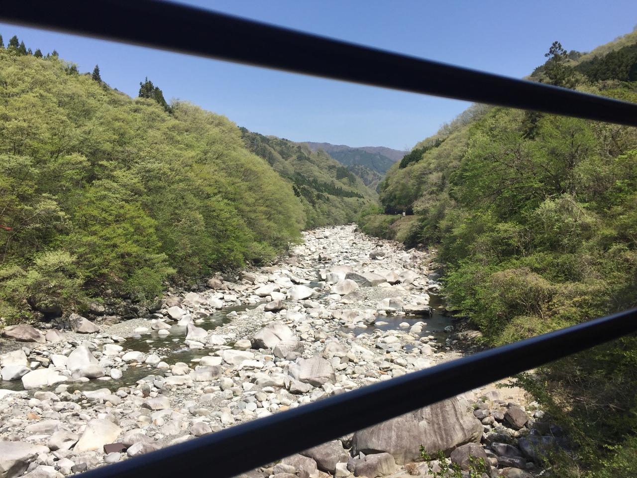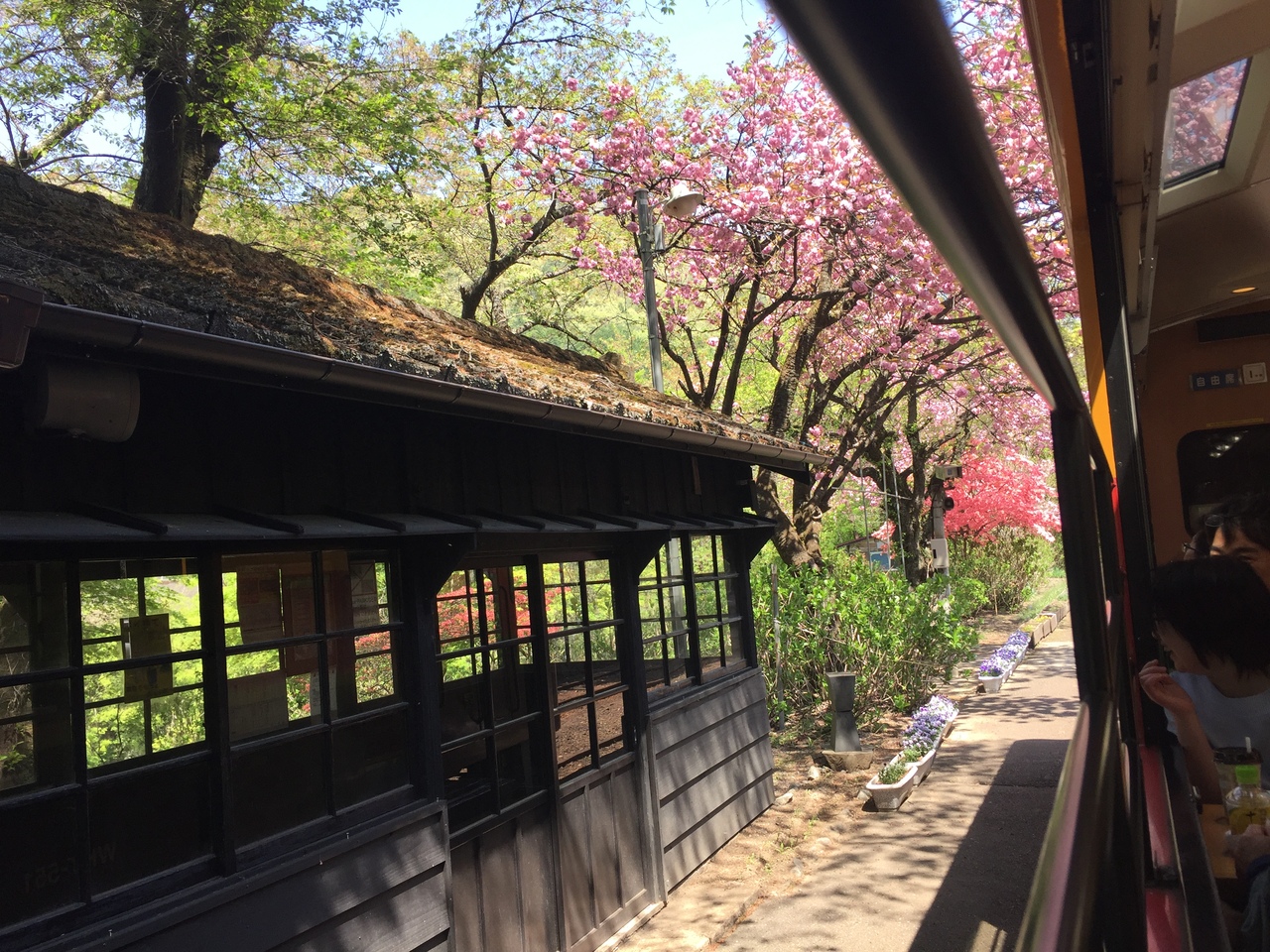 車窓は新緑 山藤 山ツツジ 姫ウツギ 八重桜などなどとても美しい景色だった。