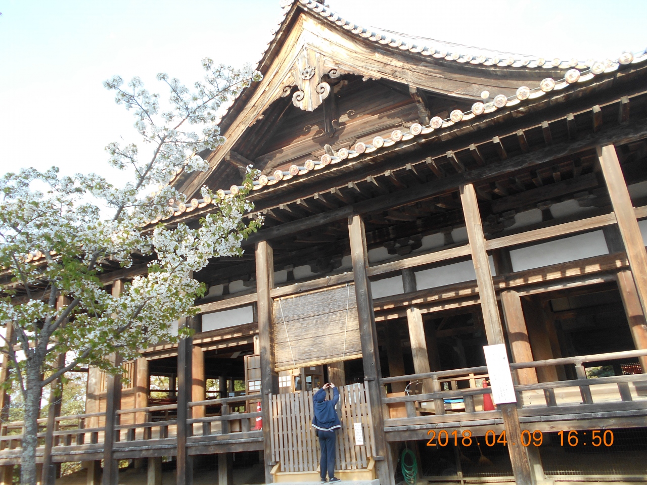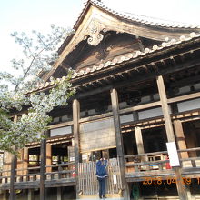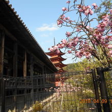 厳島神社からも比較的近いので 多くの人が訪れているようで なんとなく人の流れに沿って歩いているうちに とても大きな建物のところに出ました。戦場核という説明があり その名前が建物の雰囲気をとてもよく表していると感じました。周りをぐるっと回ってみると五重塔が小さく見えていて 満開の桜の木との素敵な風景に出会うことができました。