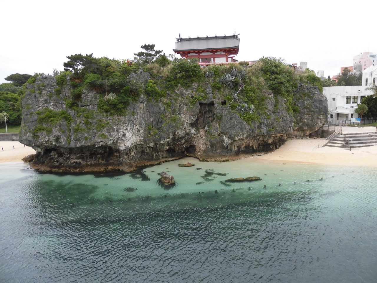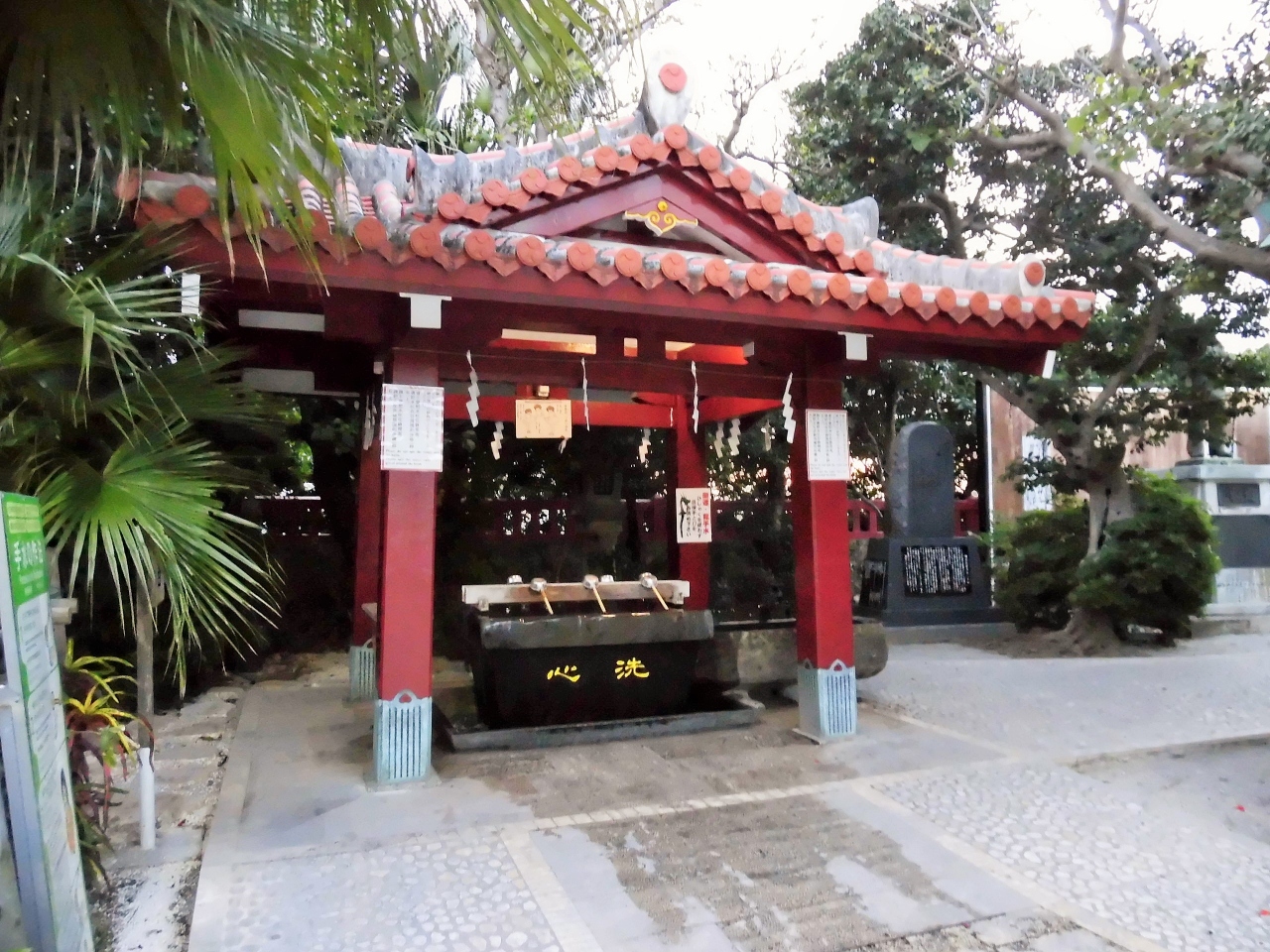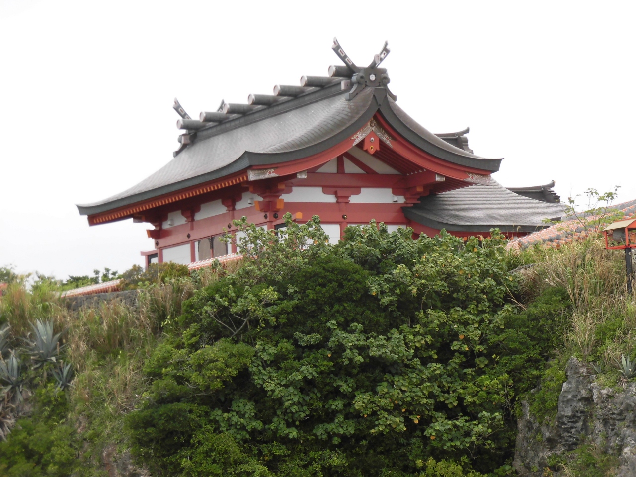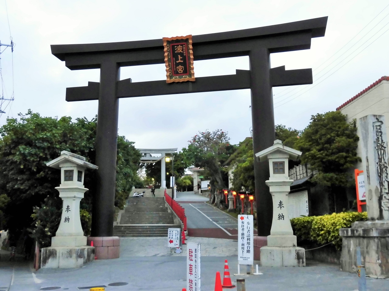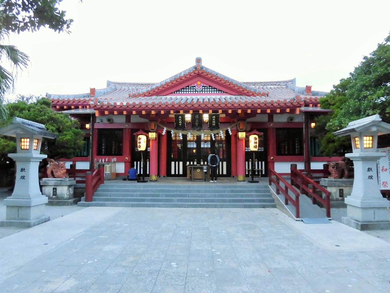 波の上ビーチのすぐ横の隆起した珊瑚礁の断崖上に建っていますので、お勧めは海にかかっている道路の上から海を挟んで本殿を見ることです。素晴らしい景色です。琉球瓦に朱塗りという沖縄らしい神社です。狛犬ではなくてシーサーというところも沖縄ですね。