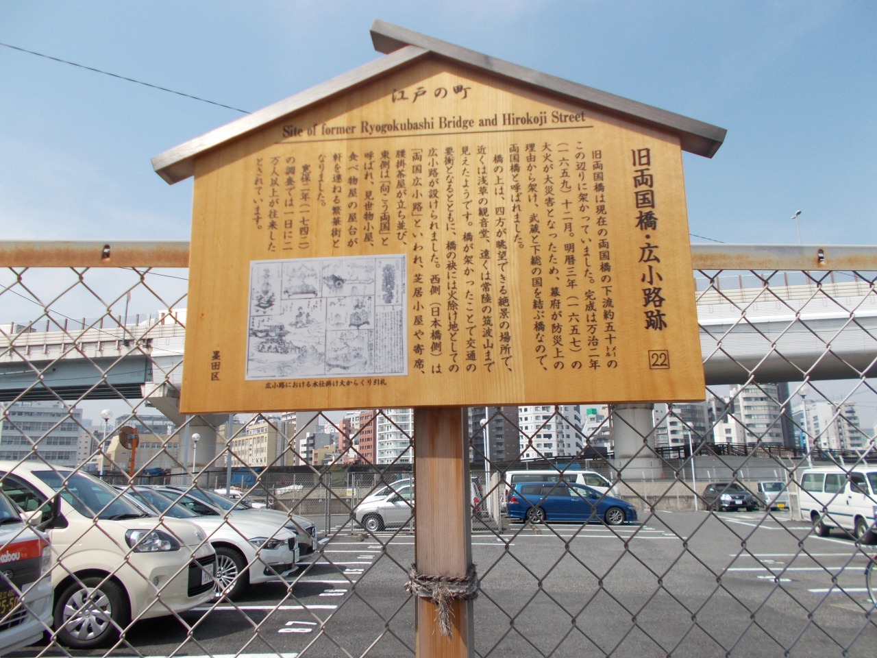 旧日本橋の広小路跡は現在パーキングになっています。その場所に高札が建てられています。それによると旧両国橋は17世紀中ごろに作られた木製の橋でその橋は現在の橋より50m下流にあったようです。その橋のたもとに広小路を作ったのは防災上の工夫です。この広小路で赤穂浪士が休息を取ったことが同じ場所にたっている高札でわかります。広小路も多くの人がかかわってきているのです。