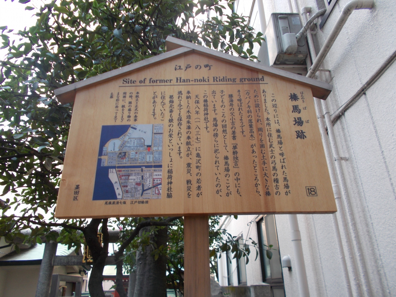 榛馬場跡は榛稲荷神社のあたりです。江戸い時代にはこの辺りは土手で囲まれていたようです。その土手に榛の木があったので名前が付いたということです。この馬場は勝海舟の父の小鉄さんの手記にも記載されているようです。今は表示板があるだけです。遺構はありません。かつては隅田川は今より川幅が広かったと思いました。