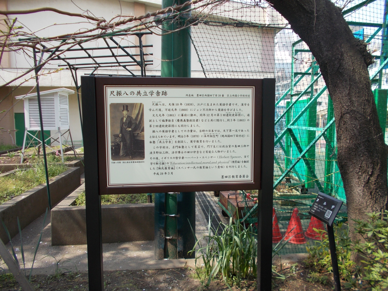 尺振八共立学舎は明治3年に両国で私塾として開設されました。英語教育を主としたいますが。漢字も重視し洋和両立の教育を行っています。塾生は1000人を超えたのです。この共立学舎は自由民権運動の時に閉鎖されています。尺振八は江戸末期から明治の初めの英語学者です。ジョン万次郎に英語を学び幕末の遣欧視察団に同行しています。明治の初めの逸材を育てています。解散されたのが残念です。