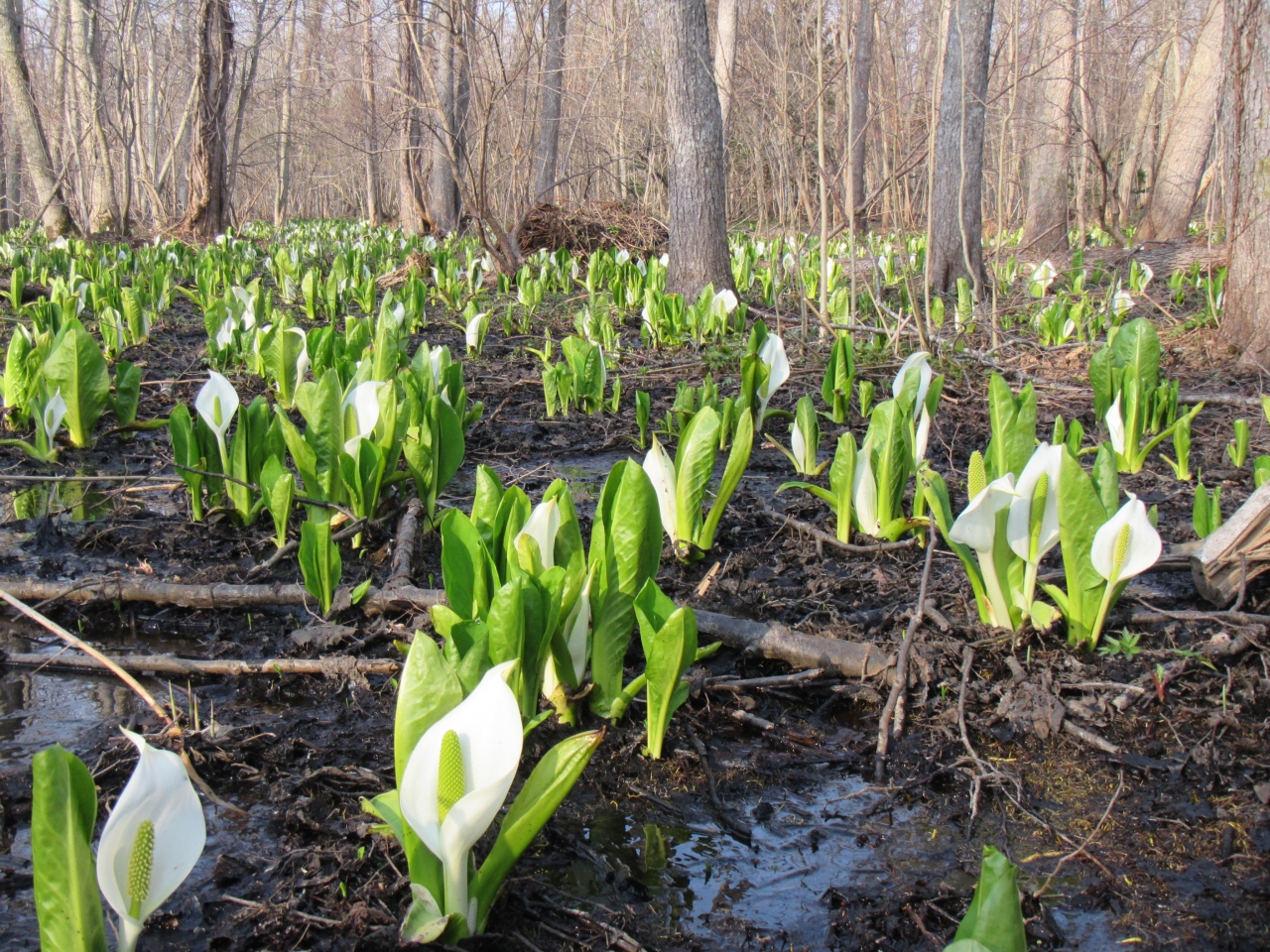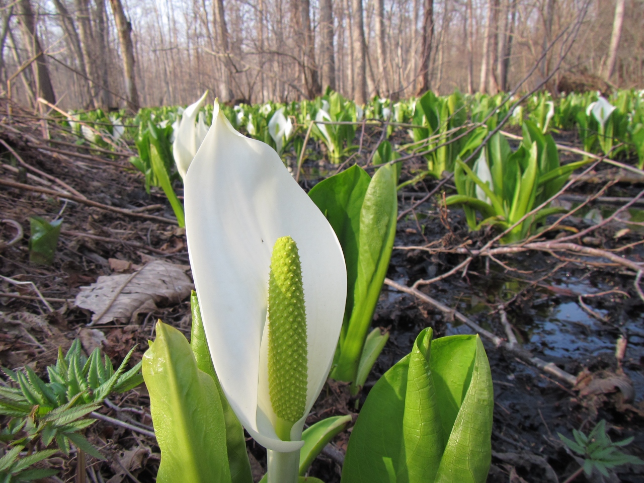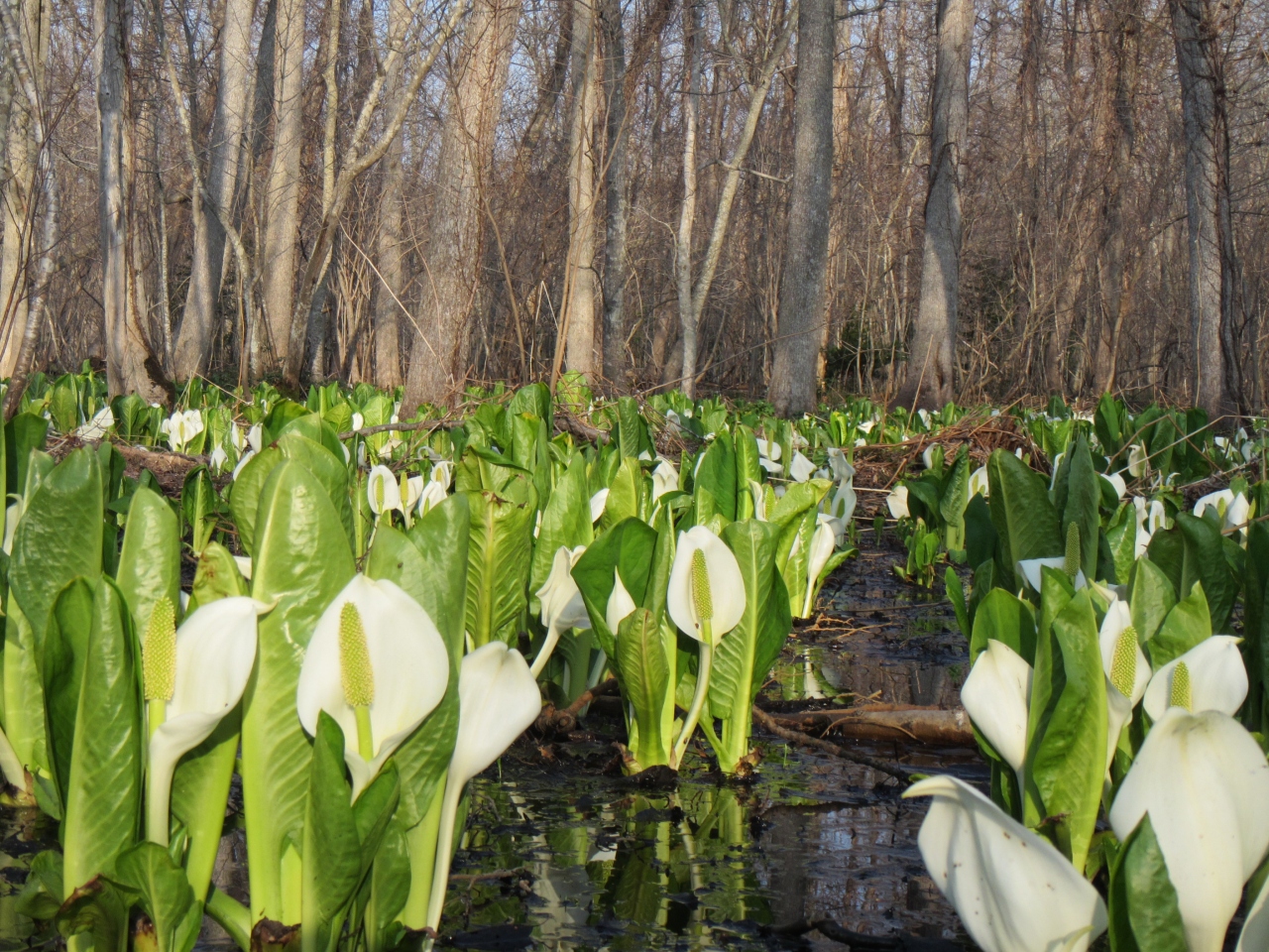 裏口を出て、総合運動公園トルナーレの手前で左に曲がり、森に差し掛かると、一面の白い苞が出迎えてくれます。