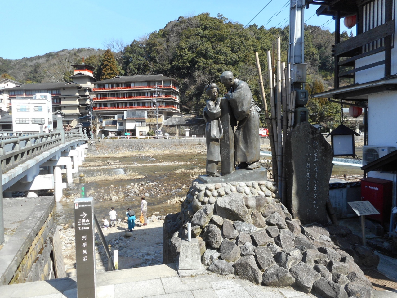 三朝橋のたもとにある足湯と公衆浴場です。足湯も公衆浴場も無料で利用できます。公衆浴場部分は、一応目隠しの衝立はありますが、橋の上からは丸見えです。利用する際は覚悟が要ります。足湯は河原でのんびり楽しめます。旅行者が利用するなら足湯がいいと思いますよ。