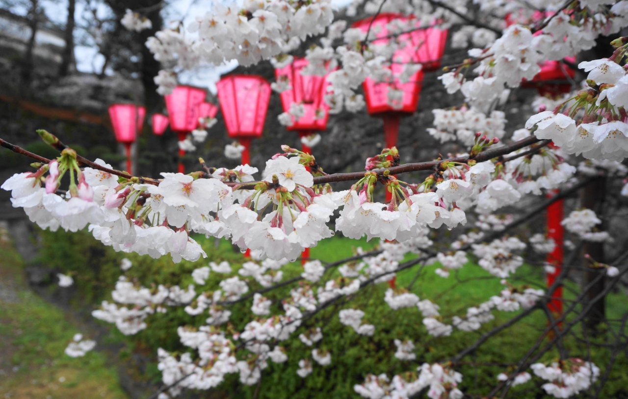 ぼんぼりが並ぶ城内、桜も満開で癒される景色でした。