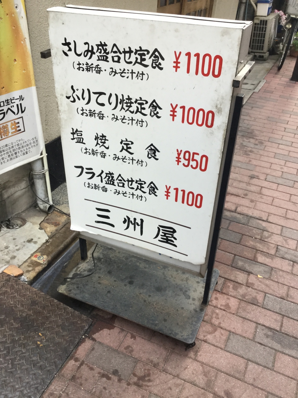 銀座一丁目駅西側の路地沿いにある大衆割烹屋さん。店頭には青い暖簾が下がっている。店内は大衆居酒屋さんの雰囲気で、テーブル席が並んでいる。平日午後、数人のお客さんがいた。刺身盛合せ定食を食べたが、鮪、ぶり等刺身は比較的活きがよく、ご飯、味噌汁等がついてまぁまぁ旨い。料理の種類は比較的多く、夜は飲むのもいいかもしれない。