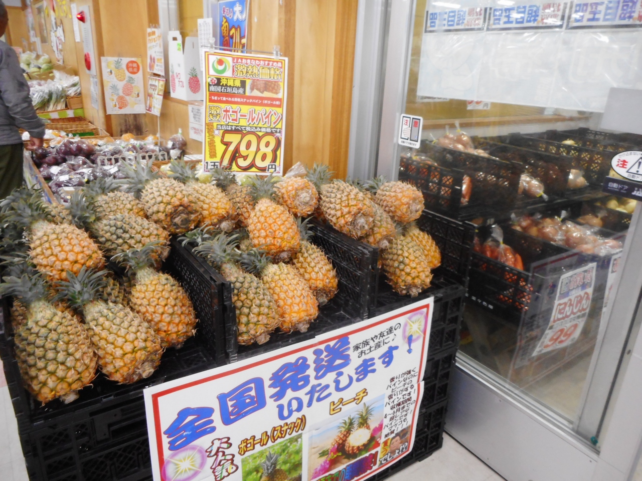 沖縄産の野菜、果物がたくさんあり、石垣産のパイナップルなどもあり、お手軽価格で購入できる。肉類、土産物もある総合スーパー並みの品ぞろえなので、空港に行く前に最後にここでショッピングするに便利な場所。