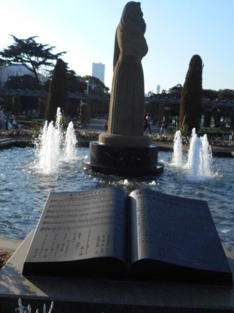 横浜の観光名所、山下公園の中心にある噴水。その噴水に立っている石像です。アメリカのサンディエゴとの姉妹都市のしるしだそうです。噴水の周りもきれいな花があって、噴水の中心に像があるので、公園の中でもよく目立つ場所になっていました。