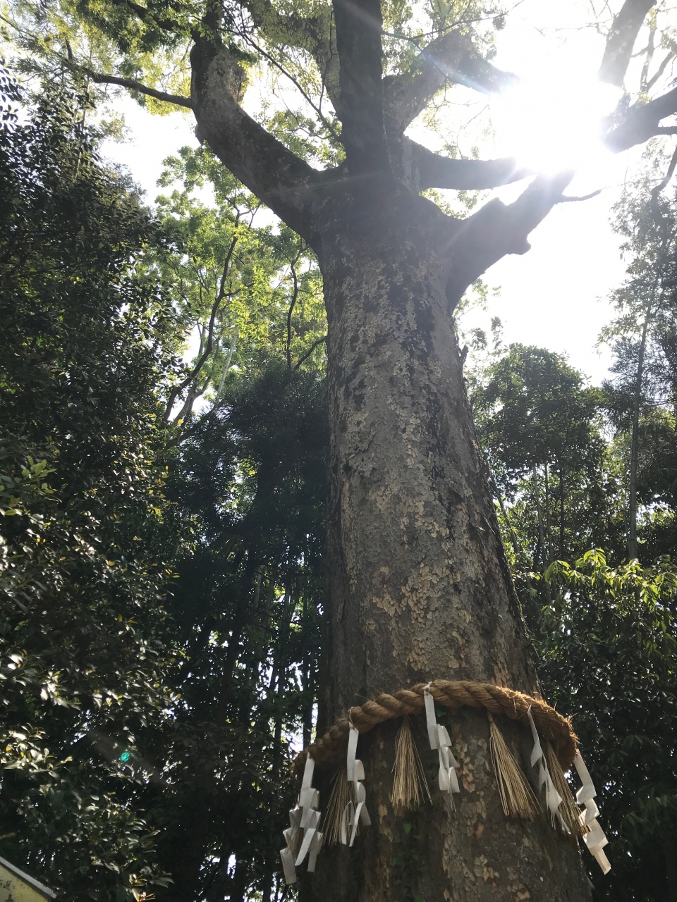 中に入ると、御神木も立派です。奥の段の上に国宝の日本最古の本殿があります。独特の雰囲気があってパワーを感じる空間でした。