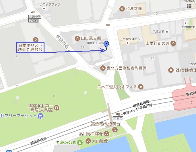 靖国神社の入口から、早稲田通りを少し、北に進むと二股に別れるようになりますが、その分かれ道を右側に進むと、九段教会の入口につきます。
