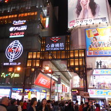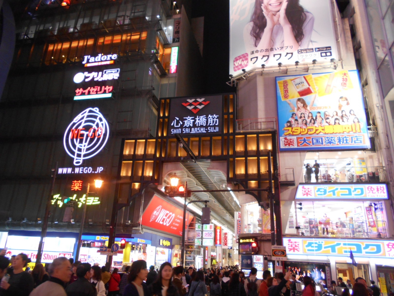 道頓堀川の北側にあるのが心斎橋筋商店街です。長いアーケード街には飲食店、衣料品、雑貨、ドラッグストア、などあらゆるお店が並んでいます。観光客もとても多く、時間帯によっては歩きづらいことも。少しわき道を入ったところにもお店があったり、楽しいです。