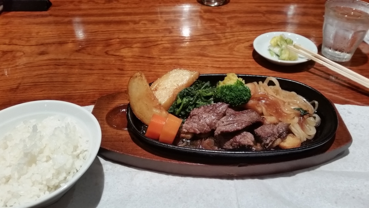 有楽町で用事があり、ランチしに行きました。銀座インズの地下1階です。ステーキランチが1480円。ポタージュスープ、野菜サラダ、漬物、ごはん、ステーキ、マンゴープリンまでついてこのお値段です。1口大のステーキの付け合わせは、たっぷりの玉ねぎとポテト、人参、ホクホクのガーリック、ほうれん草とブロッコリー。どれも美味しいです。