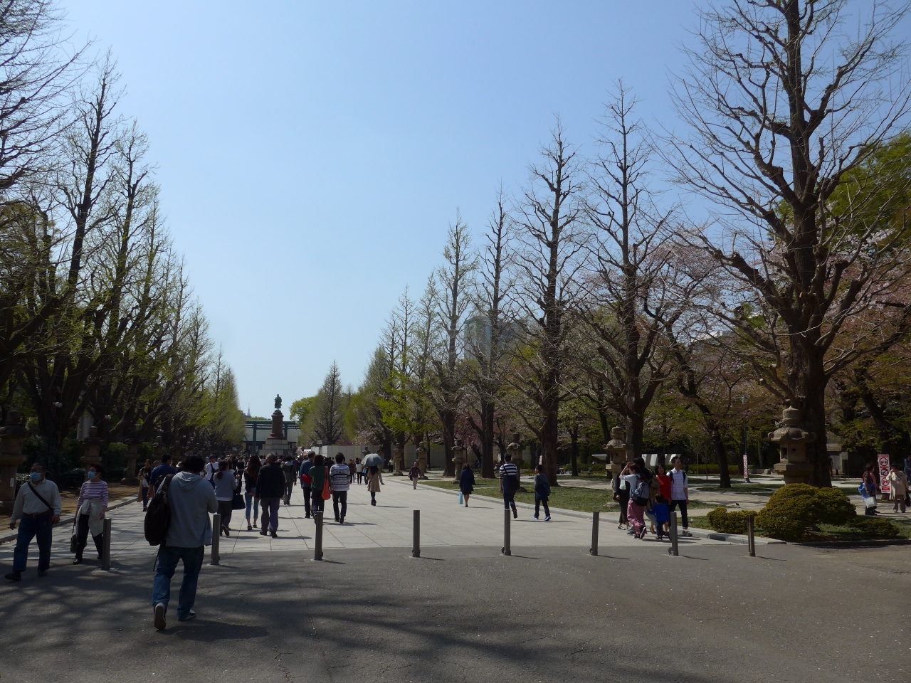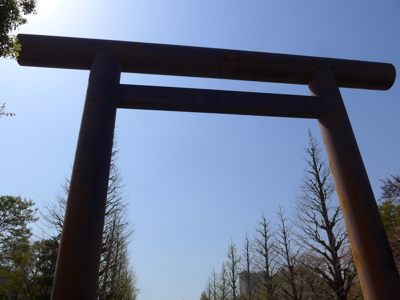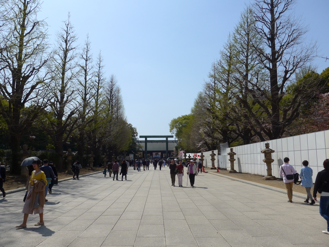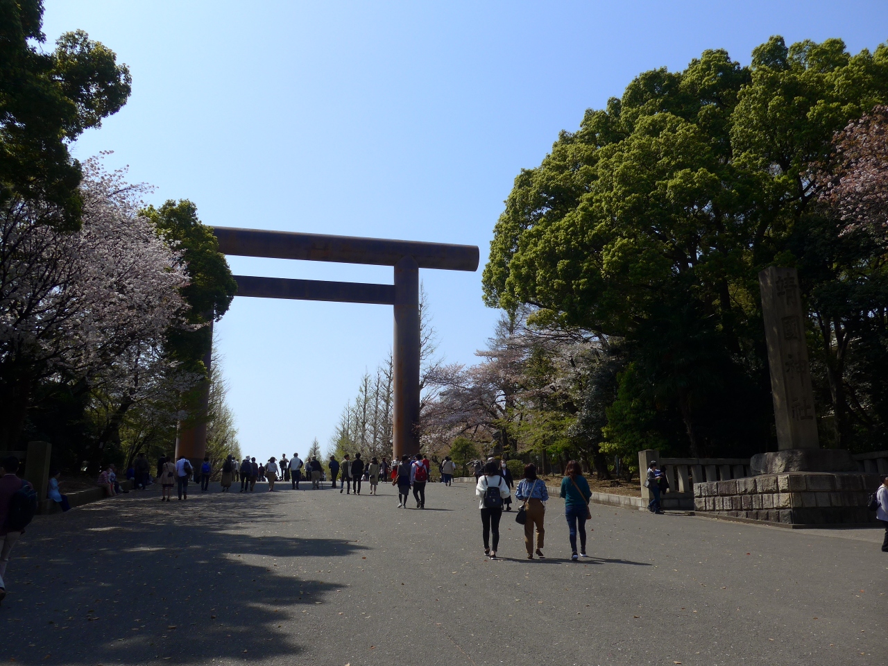 靖国神社の参道入り口付近にある大鳥居はびっくりするほどの大きさがありその下の参道から本殿に向けての砂利道そして左右にある桜の木々一見の価値ある神社であると思います。春のこの時期はさくらまつりも行われていてとても賑っていました。