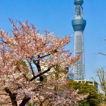 私が行った時は、ケバブ、ハンバーガー、ピザ、ポテト、海鮮丼などお店が出ていました。桜とスカイツリーのコラボは綺麗です。