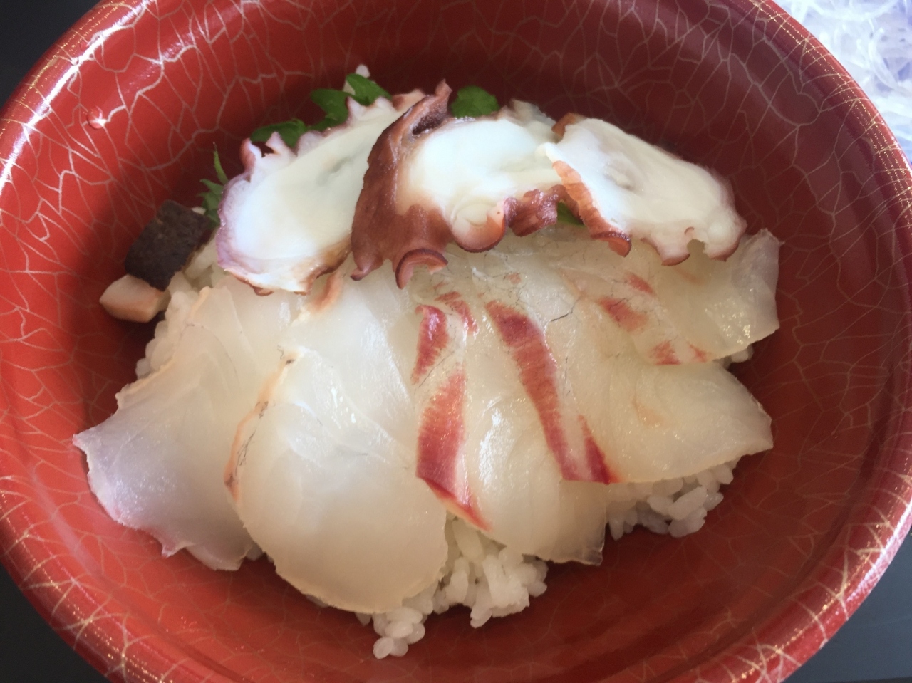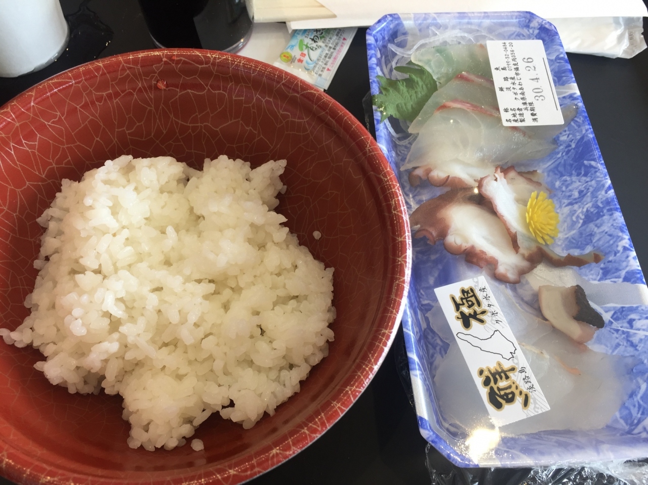 お刺身はフグ炙りや鰹のタタキ、桜鯛やタコなどがありました。シンプルですが、バス待ちがてら頂くのには程よく、ご飯が温かいので美味しくいただきました。