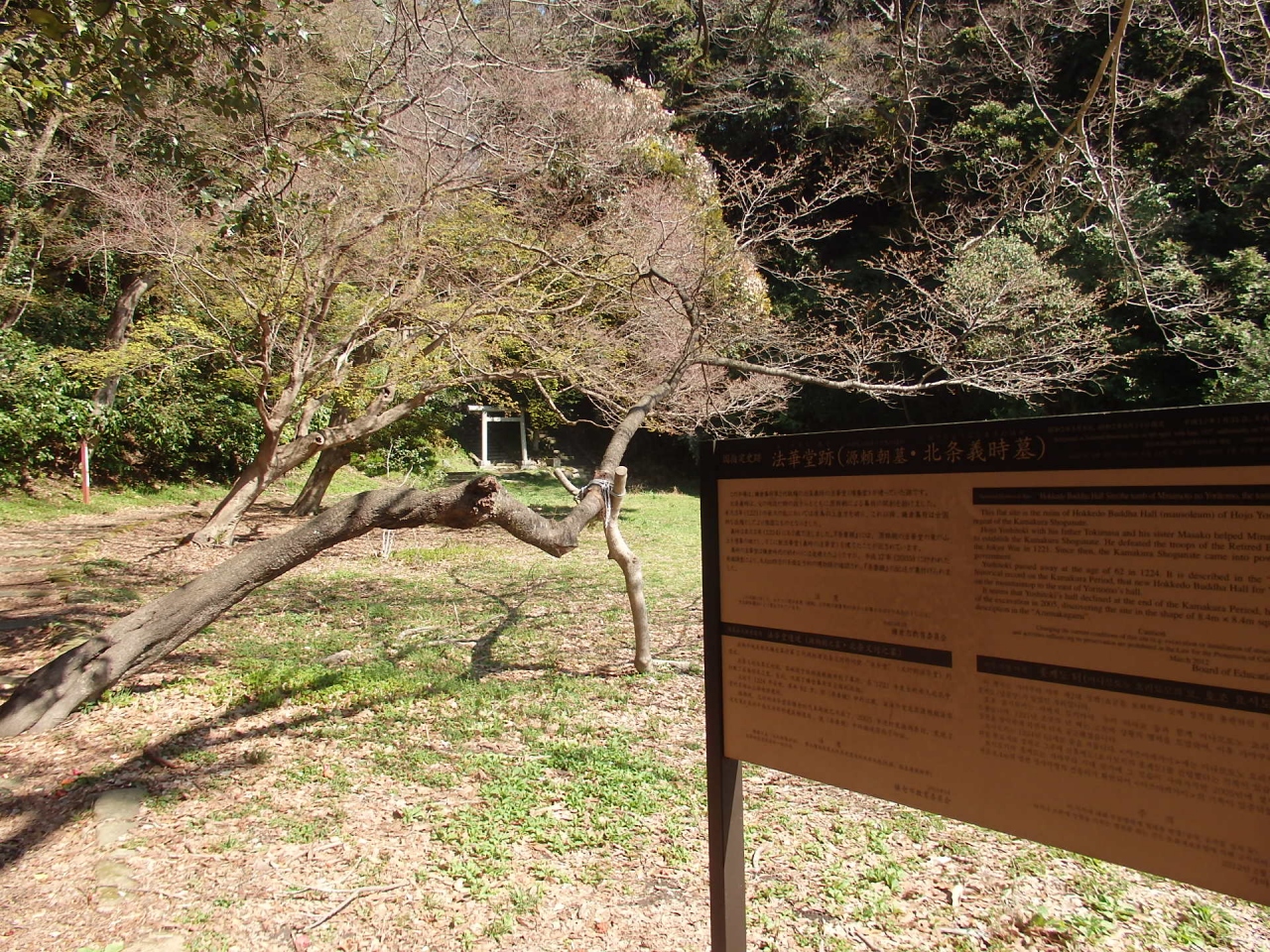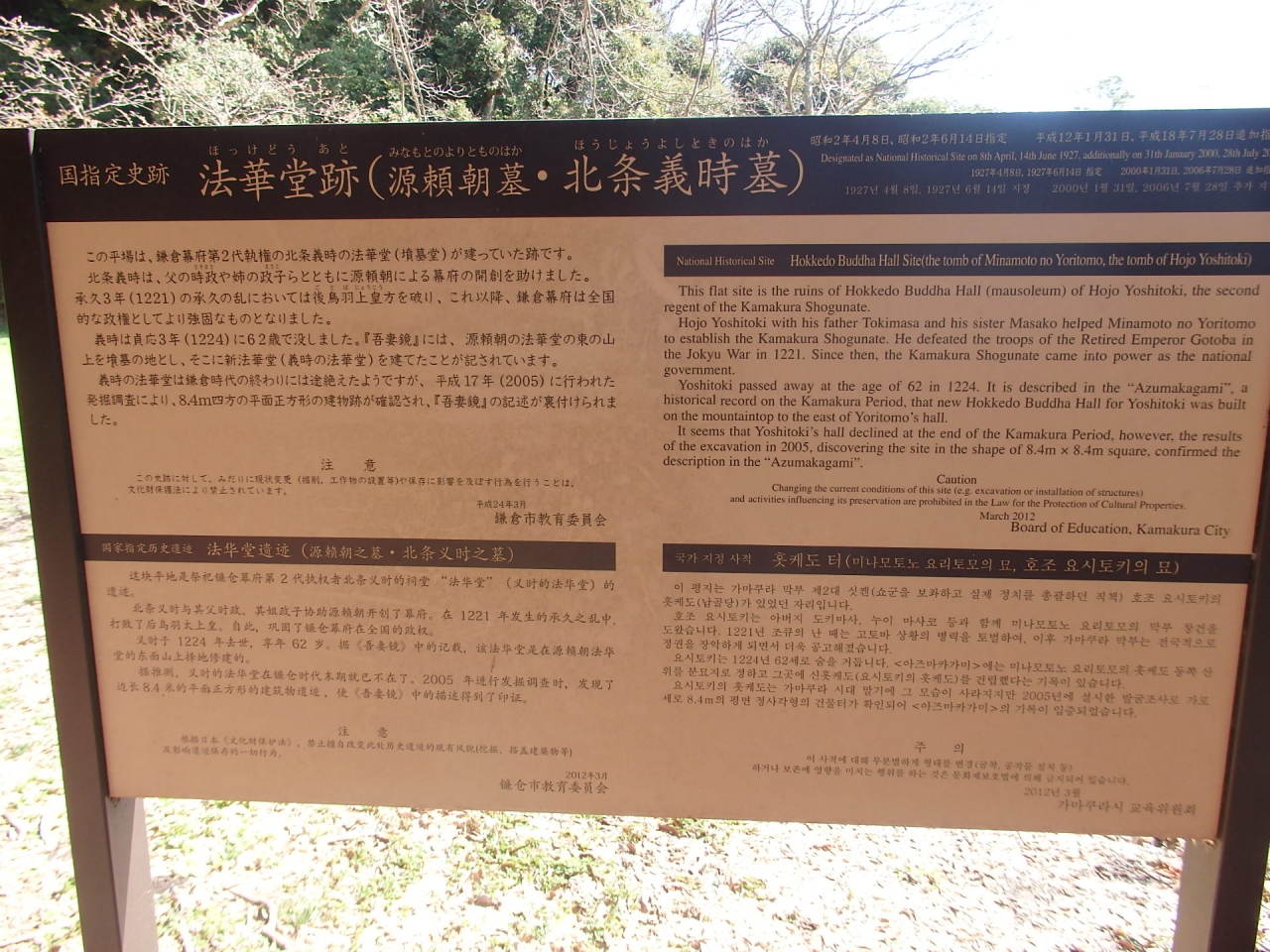 法華堂跡の説明版が源頼朝の墓のある白旗神社入り口と大江広元等3人の墓がある下の平場2箇所にありました。頼朝の墓があるところが法華堂跡(頼朝の持仏堂)で、大江広元等3人の墓の下にある平場の方は北條義時の新法華堂(頼朝の法華堂と分ける)(墳墓堂)が在ったところの様です。新法華堂は発掘調査で遺構が確認されています。鶴岡八幡宮等に比べ地味、遺構も無いのでこちらも観光客ゼロ、ゆっくり見学できました。源平合戦に興味ある人にはお勧めです