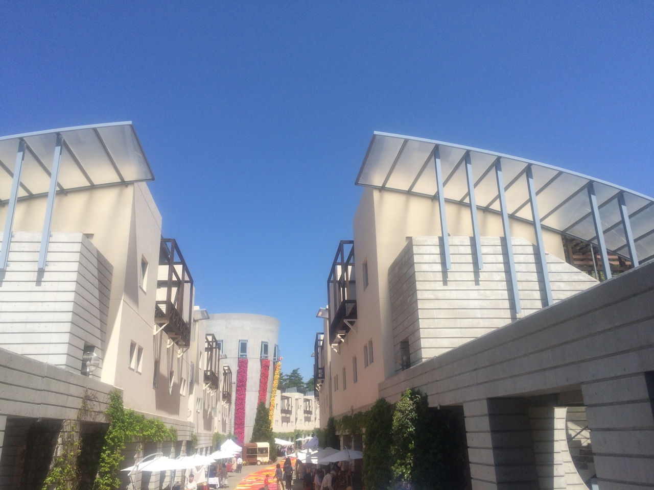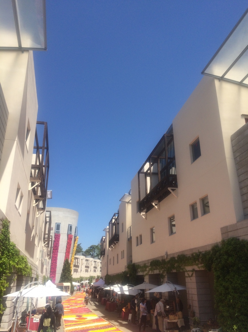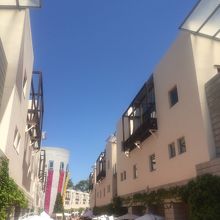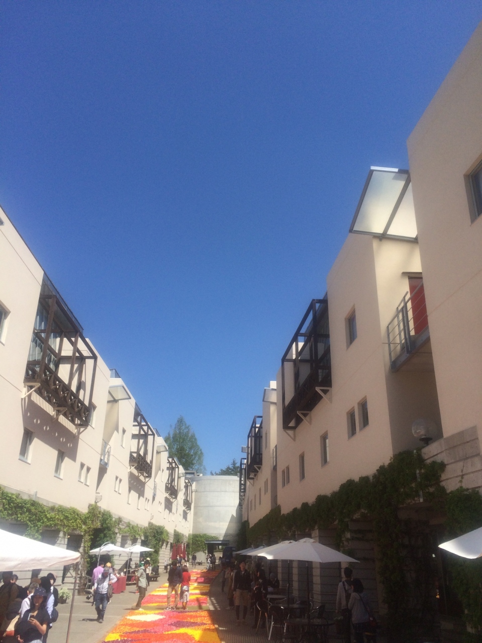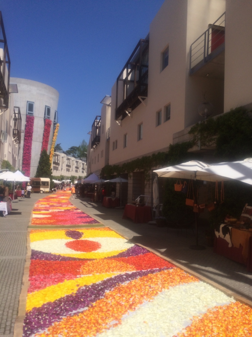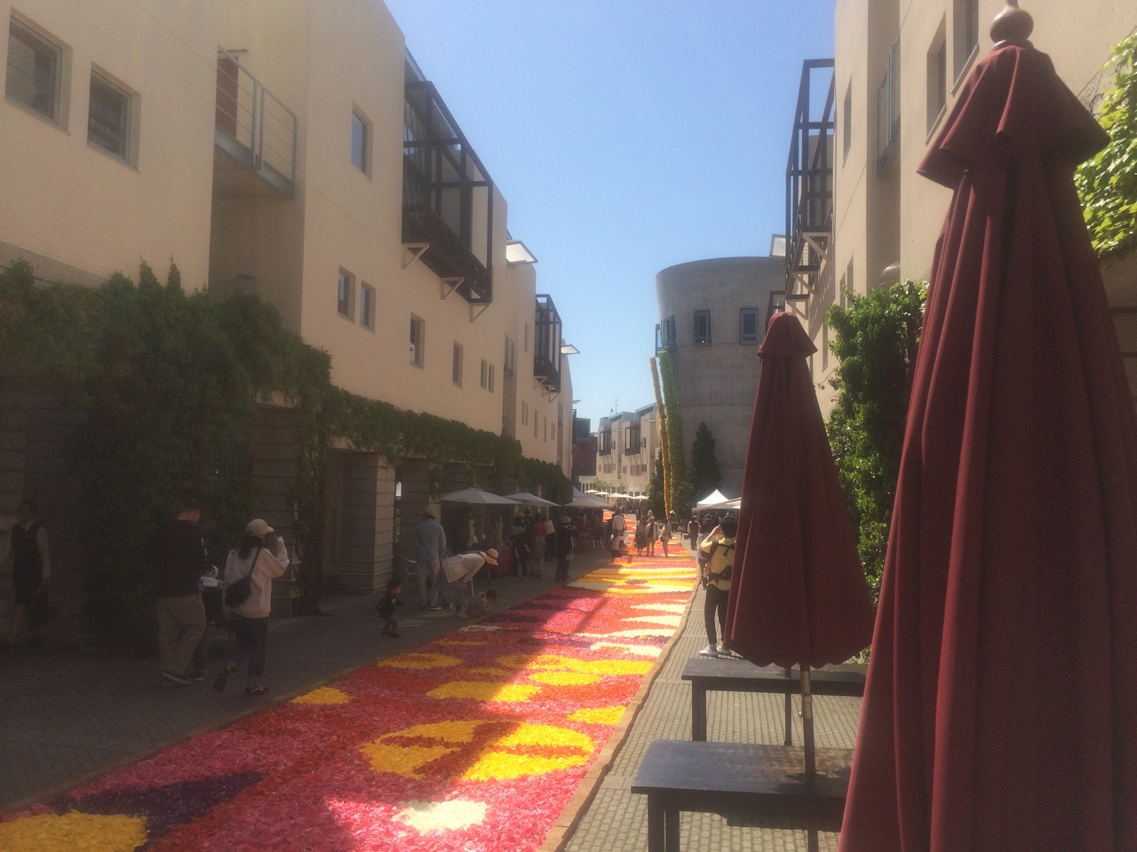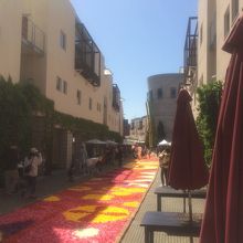 道の真ん中に、薔薇の花びらが連なって置いてあり、左右には出店等がありブラブラ歩きながらウィンドショッピングを楽しみました。ホテルの客室が道沿いにあるのも特徴的でした。パン、コーヒーを購入しテーブル、椅子があるエリアでまったり出来ました。