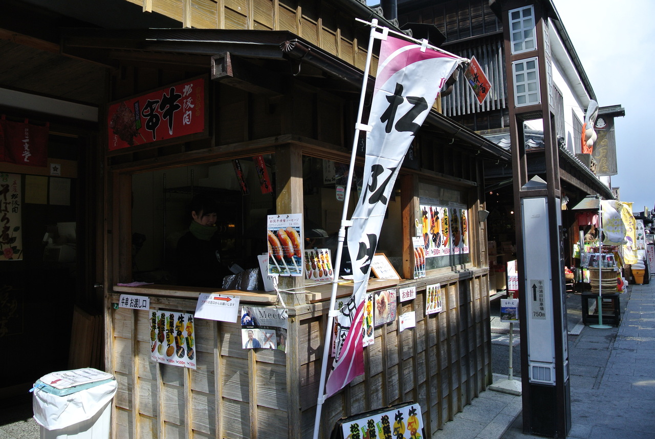 おはらい町の老舗土産屋、二光堂内にあります。店先に屋台も出ていてそちらで松坂牛串を買って食べました。側にベンチもあります。期待していたほどの柔らかさではなかったかな…。肉汁がたれないよう気をつけて食べてください。