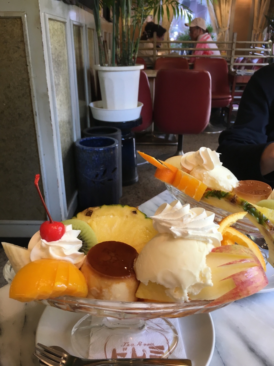 通天閣のすぐ近くにある純喫茶です。プリンローヤルというプリンアラモードをいただきました。プリンにフルーツがたくさん、バニラアイスと生クリームもトッピングされていて、結構ボリュームがあり、お腹いっぱいになりました。美味しかったです。喫煙可なのでたまに煙臭いのが嫌ですが、昭和な感じでゆっくり出来てよかったです。