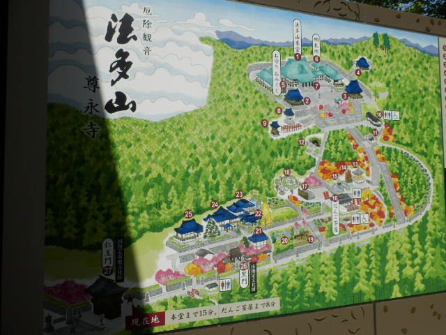 山門~だんご茶屋まで約8分、山門~本堂まで約15分の案内図を参考に参拝。