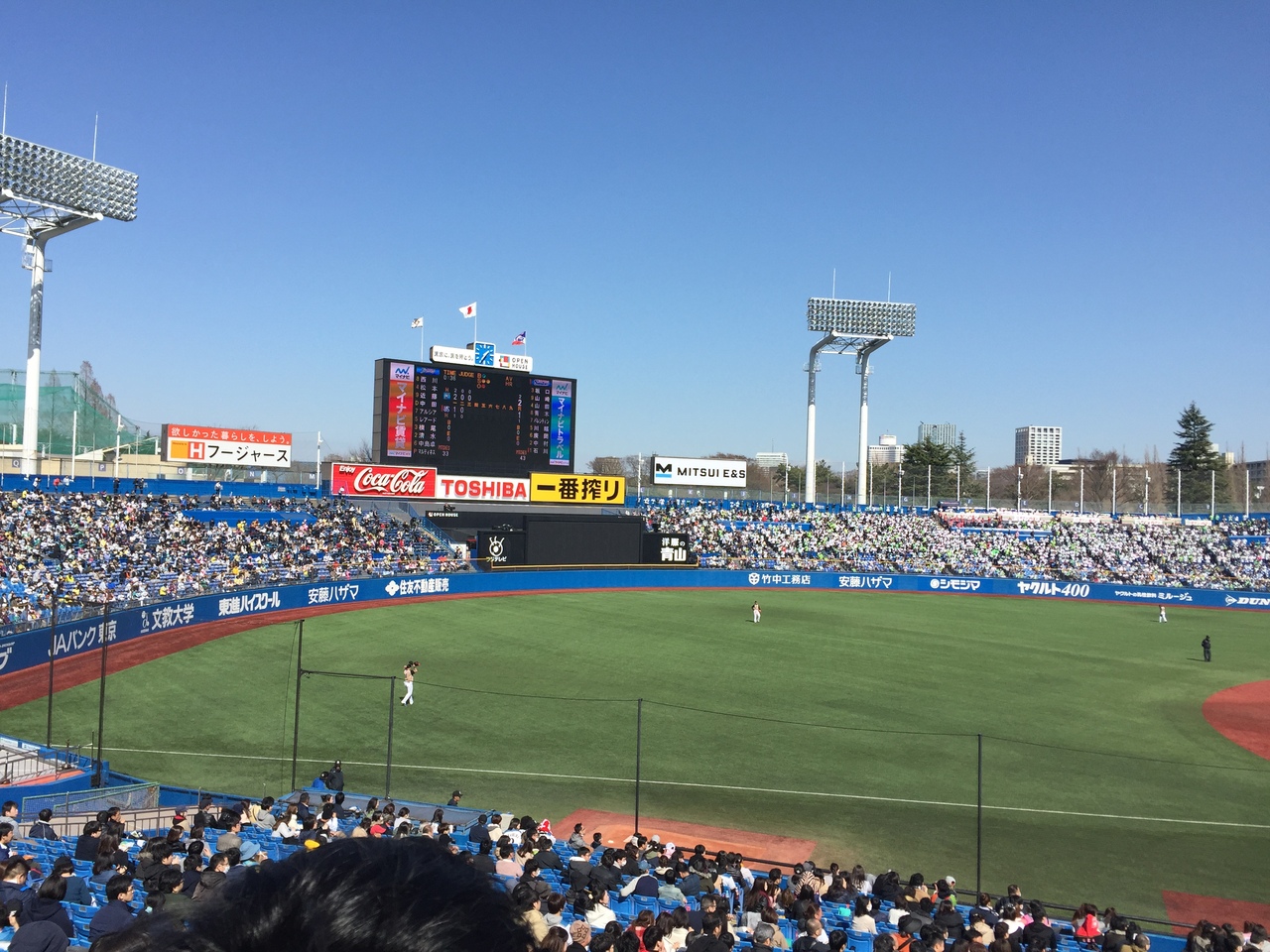 ヤクルトスワローズの本拠地です。銀座線 外苑前下車3番出口から地上に上がったら、人並みの方はついて行くと ラグビー場など横目にすぐに着きます。途中 コンビニが数件あるので、おつまみなど買っていけば良いと思います。缶ビールや、缶チューハイなどはエントランスで紙コップが貰えますので、入れ替えなければなりません。