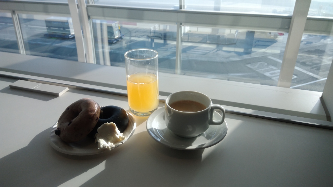 朝6時から利用できます。カードラウンジとしては珍しくドリンク以外にベーグルのサービスがあります。チーズクリームをそえることができ、2個食べてコーヒーでも飲めば軽い朝食になります。ベーグルのサービスは一定の個数で終了するようで、そのため早朝から混雑し6時30分頃には満席になっていました。
