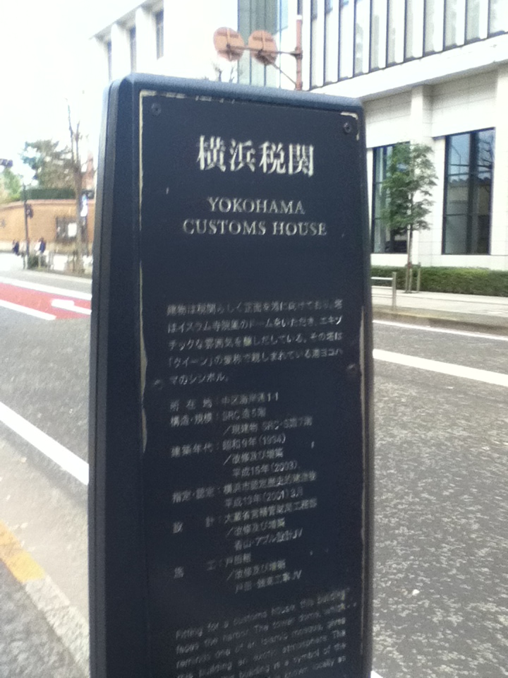 日本大通り駅北側の道路沿いにある。数人の観光客が写真を撮っていた。お勧めの点は、横浜税関本関庁舎は関東大震災で前の庁舎が焼失したため、1934年現在の庁舎が建設されたこと、建物の高さは当初の計画では47mではあったが税関長の意見により51mになり完成当時は横浜で最も高い建物であったこと、緑青色のドームがシンボルでクイーンの塔として広く親しまれていること、全体的に税関らしい重厚な雰囲気が漂っていて建物として見る価値があることである。