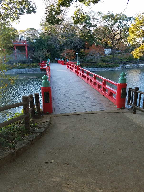 橋の上から西を臨めば池面と共に奥に通天閣が割りとと大きく見え、また池の畔から臨めば赤い橋そのものが映えるのでなかなかにフォトジェニックな空間でした。
