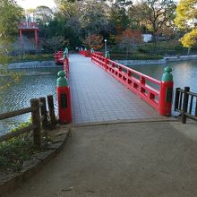 茶臼山の麓に広がる河底池の、ちょうど真ん中辺りに架かる赤い橋です。