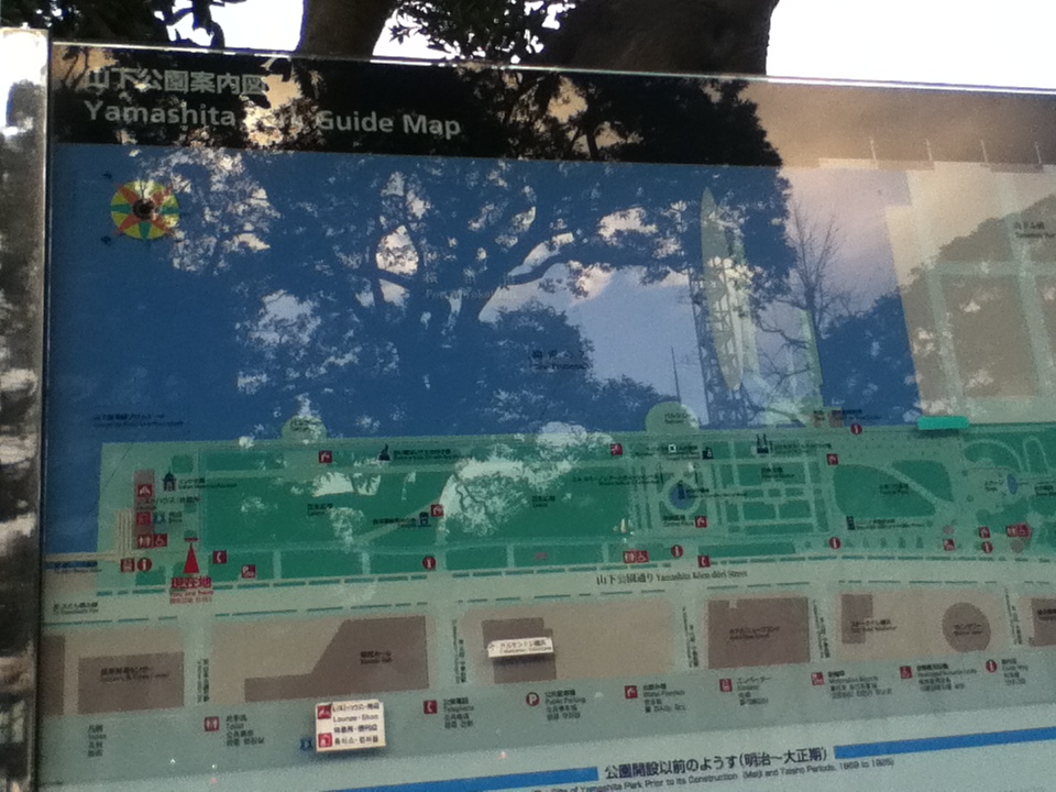 元町・中華街駅の北東にある有名な公園。週末午後、多くの人が来ていた。お勧めの点は、関東大震災の復興事業として瓦礫などを使って海を埋め立て造成して1930年に開園したこと、園内は広く芝生が広がり木々も並んでいて沈床花壇、氷川丸があり北側には横浜港があること、赤い靴はいてた女の子像や水の守護神像、西洋理髪発祥の地の碑など観光施設も多いこと、ゆっくり散策したり休憩することを楽しめること、公園の南側にはレストランやカフェもあり食事を楽しめることである。