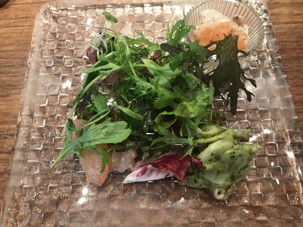 まず前菜は新鮮な海鮮を使用した4種盛り合わせ。どれもうまく味付けしてありテンション上がります。フォカッチャはシンプルなものとくるみの2種。冷たくてもしっとりモチモチで美味しい。