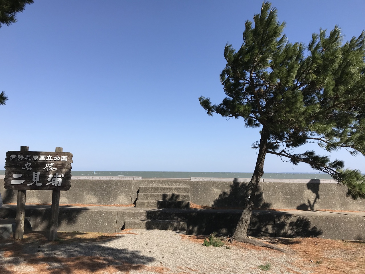 名所二見浦の海岸線だ。広大な伊勢湾を望む。