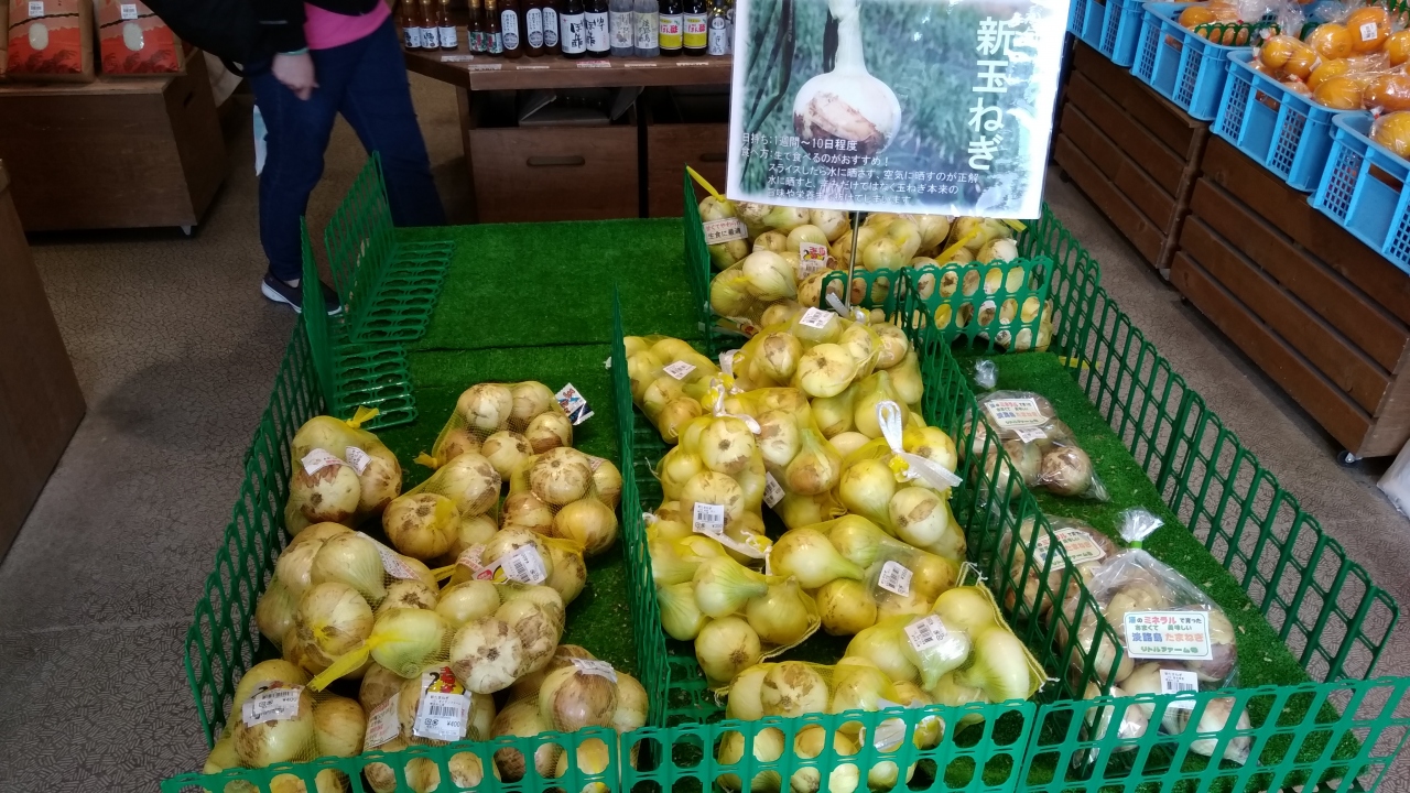 地元のスーパーのような造りのお店ですが、地産品を売るお土産屋さん兼食堂のようです。 ドアを入ると直正面に玉ねぎ売り場があります。