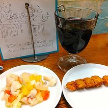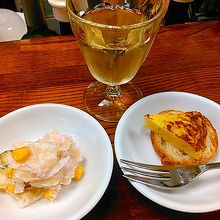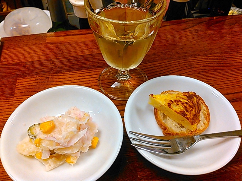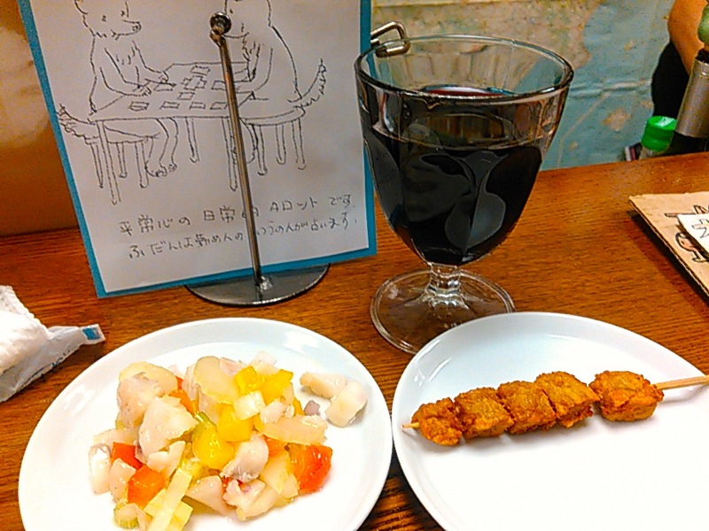 お酒を一杯オーダーすると、自動的にタパスが2皿(ドリンクによっては1皿)ついてきます。タパスは日替わりで、2杯目は内容がかぶらないようにつけてくれるし、好みのものも選べると思います。タパスがいらない場合は言えばワインのほうをナミナミとついでくれたり(増量)。ゆるーい営業スタイルがなんとも西荻的。たまにライブやったり占いやったりしています。