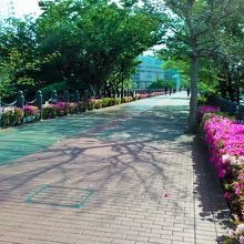 その廃線跡を利用し、約500mの区間のレールを残した上で緑地化したプロムナードです。