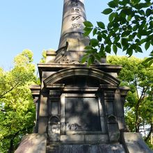 彫刻を施したとても立派な記念碑です。それが小山の上に設置されているので、さらに高さを増して、その威容はいかに淀川の改修が大規模工事であったかをしのばせます。もっとも、この季節、周囲の木々の葉が茂っていて塔自体が見にくくなっていました。その木は桜のようでしたので、桜咲くころはきっととてもきれいだろうなと察せられます。