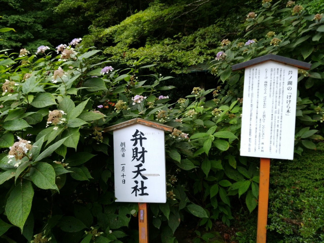 箱根神社の宝物殿です。芦ノ湖湖畔に車を停めて、参道を本殿に向かいます。参拝後に本殿横の脇参道から芦ノ湖方面に下ると宝物殿があります。宝物殿の前にも駐車場がありますので、宝物殿に行きたい方はそちらに停めた方が良いかもしれません。入場料は500円との事。早朝でしたのでまだ開館前で今回は見送りです。目の前に弁財天社の池があり、なかなか風流で良い雰囲気でした。